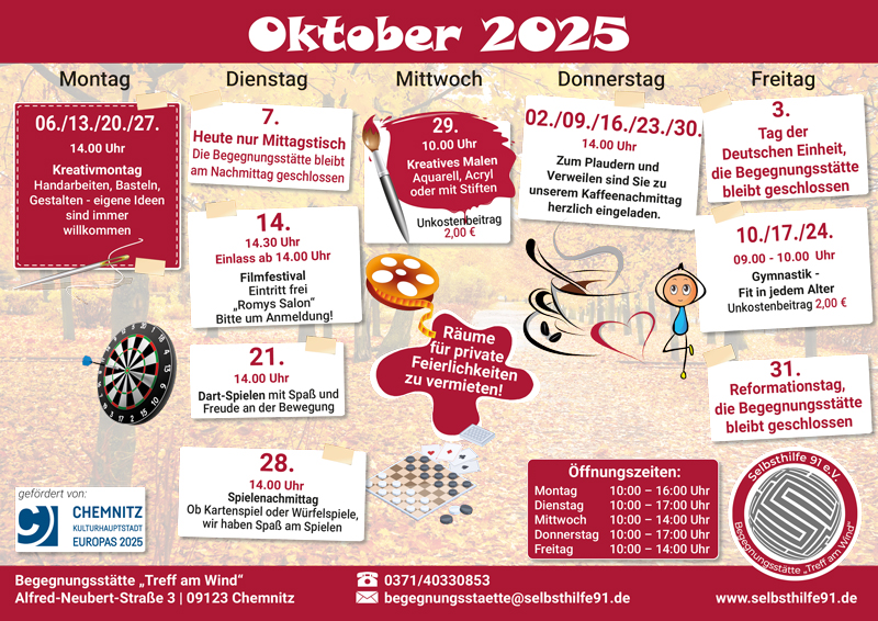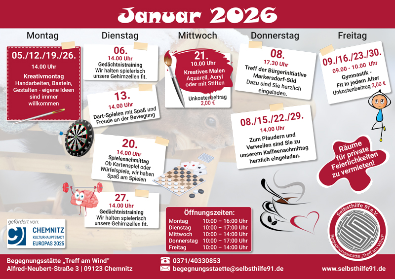 In unserer Begegnungsstätte ist JEDERMANN herzlich willkommen. Besonders freuen wir uns über Besucher, die eigene Aktivitäten und Ideen in unser Klubleben einbringen. Für Vorschläge und Wünsche haben wir immer ein offenes Ohr und bei der Realisierung neuer Gedanken gibt es von uns die größtmögliche Unterstützung.